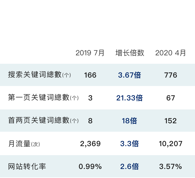 这位客户正在转型阶段,并在2019年8月和微思科技开展合作,定立未来一年的排名目标,微思在2019年12月完满完成客户所订立的所有目标。